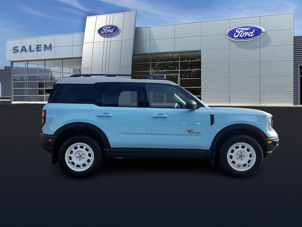 "Odometer is 14765 miles below market average!*CLEAN HISTORY REPORT* ***PLEASE CALL 603-898-9766*** Power moonroof SYNC 3/Apple CarPlay/Android Auto.*****At Salem Ford you win!***** ****PLEASE CALL 603-898-9766****We make the car buying process very simple by displaying the lowest price on the window. We price our vehicles more aggressively than anyone else in the area. For that reason we're proud to display it on every vehicle's window.We believe there is more to buying a vehicle than worrying about the price. For that reason Key Auto has simplified that process for our customers. When we price a vehicle we take the following into consideration: 1) market conditions 2) what the area dealers are selling them for 3) Kelly Blue Book* retail. This way when you leave a Key Auto Dealership you're confident you've received the absolute best deal.Clean CARFAX.Certified. Ford Gold Certified Details: * Transferable Warranty * Warranty Deductible: $100 * Vehicle History * and 22000 FordPass Rewards Points to use toward first two maintenance visits * Powertrain Limited Warranty: 84 Month/100000 Mile (whichever comes first) from original in-service date * 172 Point Inspection * Roadside Assistance * Limited Warranty: 12 Month/12000 Mile (whichever comes first) after new car warranty expires or from certified purchase date2023 Ford Bronco Sport Heritage Limited 4D Sport Utility Robins Egg Blue Heritage Limited 4WD 8-Speed AutomaticSalem Ford is proud to present you with another True Market Priced Pre-Owned Vehicle. This 2023 Ford Bronco Sport Heritage Limited Ford Gold Certified is loaded with the following Factory Options: Power moonroof and SYNC 3/Apple CarPlay/Android Auto Equipment Group 410A Ford Gold Certified Certified Power moonroof SYNC 3/Apple CarPlay/Android Auto 10 Speakers 4-Wheel Disc Brakes ABS brakes Air Conditioning AM/FM radio: SiriusXM AM/FM Stereo Auto High-beam Headlights Auto-dimming Rear-View mirror Automatic temperature control B & O Sound System by Bang & Olufsen w/HD Radio Brake assist Cargo Management System Compass Delay-off headlights Driver door bin Driver vanity mirror Dual front impact airbags Dual front side impact airbags Electronic Stability Control Emergency communication system: SYNC 3 911 Assist Four wheel independent suspension Front & Rear Floor Liners Front & Rear Splash Guards Front anti-roll bar Front Bucket Seats Front Center Armrest Front dual zone A/C Front fog lights Front License Plate Bracket Front reading lights Fully automatic headlights Garage door transmitter Heated door mirrors Heated steering wheel Illuminated entry Knee airbag Low tire pressure warning Lthr-Trimmed/Vinyl Htd Sport Contour Bucket Seats Memory seat Navigation System Occupant sensing airbag Outside temperature display Overhead airbag Overhead console Panic alarm Passenger door bin Passenger vanity mirror Power door mirrors Power driver seat Power passenger seat Power steering Power windows Radio data system Rear anti-roll bar Rear Parking Sensors Rear reading lights Rear seat center armrest Rear window defroster Rear window wiper Remote keyless entry Security system SiriusXM Speed control Speed-sensing steering Speed-Sensitive Wipers Split folding rear seat Steering wheel mounted audio controls SYNC 3 Communications & Entertainment System Tachometer Telescoping steering wheel Tilt steering wheel Traction control Trip computer Variably intermittent wipers and Wheels: 17""Oxford White-Painted Aluminum!!EcoBoost 2.0L I4 GTDi DOHC Turbocharged VCT"
