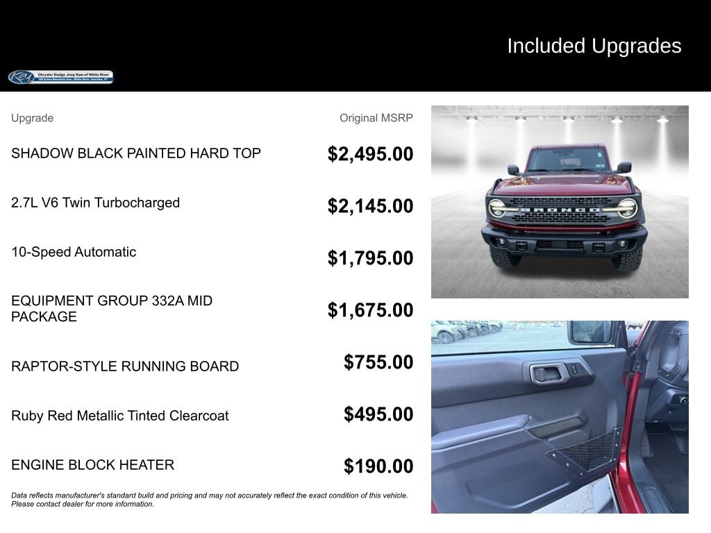 I want to start off by saying I have been waiting for the release for years and had very high expectations because I grew up in a bronco family. When I bought mine I was not disappointed. It was a beautiful blend of nostalgia and new features married to create a new vehicle in the small suv class that is different then all the others. There isn't much I don't like about the design. I have the big bend with a couple add on options. I'm very happy!… - 5.0