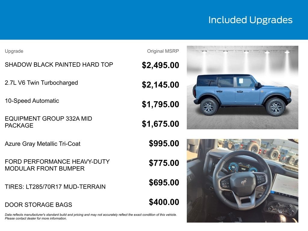 KEY FORD OF EXETER is proud to present you with another True Market Priced Vehicle. This 2025 Ford Bronco Badlands is loaded with the following Factory Options: Equipment Group 332A Mid Package (2-Door Intelligent Access w/Lock/Unlock, Ambient Footwell Lighting, Connected Navigation, Dr & Pass Illuminated Sliding Visor Vanity Mirrors, Dual Smart Charging USB Ports, Dual-Zone Electronic Automatic Temperature Control, Front Row Heated Seats, Power Outlet - Back Side of Center Floor Console, and Rear Parking Sensors), 4-Wheel Disc Brakes, 4.7 Axle Ratio, 7 Speakers, ABS brakes, Air Conditioning, Alloy wheels, AM/FM radio: SiriusXM with 360L, AM/FM Stereo, Auto High-Beam Headlamps, Auto High-beam Headlights, Auto-dimming Rear-View mirror, BLIS Blind Spot Information System, Brake assist, Compass, Delay-off headlights, Door Storage Bags, Driver door bin, Driver vanity mirror, Dual front impact airbags, Dual front side impact airbags, Electronic Stability Control, Emergency communication system: 911 Assist, Engine Block Heater, Exterior Parking Camera Rear, Ford Performance Heavy-Duty Modular Front Bumper, Front anti-roll bar, Front Bucket Seats, Front Center Armrest, Front fog lights, Front reading lights, Front wheel independent suspension, Fully automatic headlights, Hard Top Sound Deadening Headliner, Heated door mirrors, Heated front seats, Heated steering wheel, Illuminated entry, Integrated roll-over protection, Lane-Keeping System, Leather Shift Knob, Low tire pressure warning, Marine Grade Vinyl Heated Bucket Seats, Occupant sensing airbag, Outside temperature display, Overhead airbag, Overhead console, Panic alarm, Passenger door bin, Passenger vanity mirror, Power door mirrors, Power steering, Power windows, Pre-Collision Assist w/Automatic Emergency Braking, Radio data system, Rear-View Camera, Rear-Window Defroster & Washer, Remote keyless entry, Security system, Shadow Black Painted Hard Top, SiriusXM w/360L, Speed control, Split folding rear seat, Steering wheel mounted audio controls, SYNC 4, Tachometer, Telescoping steering wheel, Tilt steering wheel, Traction control, Trip computer, Variably intermittent wipers, Voltmeter, and Wheels: 17" Carbonized Gray-Painted Aluminum!! Price includes: $2500 - Retail Customer Cash. Exp. 03/31/2026