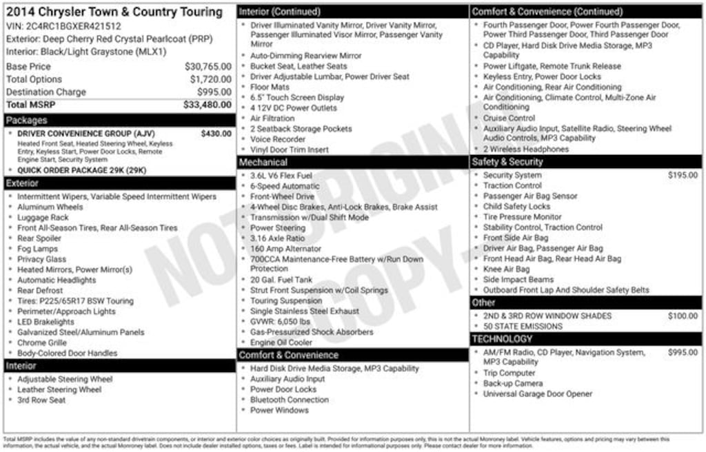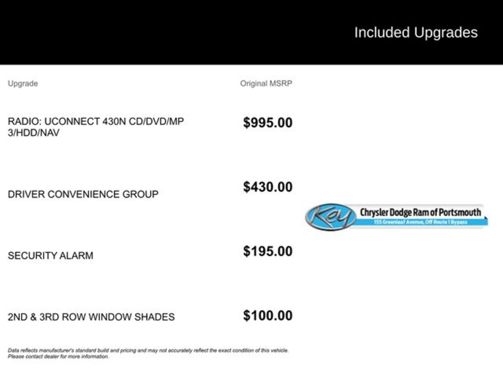 Key Chrysler Dodge Ram of Portsmouth is proud to present you with another True Market Priced Pre-Owned Vehicle. Transparent Pricing Of $ !! This 2014 Chrysler Town & Country Touring is loaded with the following Factory Options: Black/Light Graystone Leather Driver Convenience Group (Bright Door Handles, Heated Front Seats, Heated Steering Wheel, Keyless Enter-N-Go, Remote Proximity Keyless Entry, Remote Start System, and Security Alarm), Quick Order Package 29K, Black/Light Graystone Leather, 1-Yr SIRIUSXM Travel Link Service, 17" x 6.5" Aluminum Wheels, 2nd & 3rd Row Window Shades, 3.16 Axle Ratio, 3rd row seats: split-bench, 4-Wheel Disc Brakes, 40GB Hard Drive w/28GB Available, 6 Speakers, 6.5" Touch Screen Display, A/V remote, ABS brakes, Air Conditioning, Alloy wheels, AM/FM radio: SiriusXM, Anti-whiplash front head restraints, Audio Jack Input for Mobile Devices, Auto-dimming Rear-View mirror, Automatic temperature control, Bodyside moldings, Brake assist, Bumpers: body-color, CD player, Compass, Delay-off headlights, Driver door bin, Driver vanity mirror, Driver's Seat Mounted Armrest, Dual front impact airbags, Dual front side impact airbags, DVD-Audio, Electronic Stability Control, Front anti-roll bar, Front Bucket Seats, Front dual zone A/C, Front fog lights, Front reading lights, Front wheel independent suspension, Fully automatic headlights, Garage door transmitter, Garmin Navigation System, Headphones, Heated door mirrors, Illuminated entry, Knee airbag, Leather Shift Knob, Leather Trimmed Bucket Seats (ML), Low tire pressure warning, Occupant sensing airbag, Outside temperature display, Overhead airbag, Overhead console, Panic alarm, ParkView Rear Back-Up Camera, Passenger door bin, Passenger seat mounted armrest, Passenger vanity mirror, Power door mirrors, Power driver seat, Power Liftgate, Power steering, Power windows, Radio data system, Radio: Uconnect 430 CD/DVD/MP3/HDD, Radio: Uconnect 430N CD/DVD/MP3/HDD/NAV, Rear air conditioning, Rear reading lights, Rear window defroster, Rear window wiper, Reclining 3rd row seat, Remote keyless entry, Roof rack, SiriusXM Travel Link, Speed control, Split folding rear seat, Spoiler, Steering wheel mounted audio controls, Tachometer, Telescoping steering wheel, Tilt steering wheel, Touring Suspension, Traction control, Trip computer, and Variably intermittent wipers!!