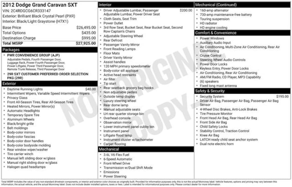 Key Chrysler Dodge Ram of Portsmouth is proud to present you with another True Market Priced Pre-Owned Vehicle. Transparent Pricing Of $ !! This 2012 Dodge Grand Caravan SXT is loaded with the following Factory Options: Power Convenience Group I (Black Side Roof Rails, Integrated Roof Rail Crossbars, Left Power Sliding Door, Power Adjustable Pedals, Power Liftgate, Right Power Sliding Door, and Super Console), Quick Order Package 29R, 16" x 6.5" Aluminum Wheels, 2nd Row Buckets w/Fold-In-Floor, 3.16 Axle Ratio, 3rd row seats: split-bench, 4-Wheel Disc Brakes, 6 Speakers, ABS brakes, Air Conditioning, Alloy wheels, AM/FM radio, Anti-whiplash front head restraints, Audio Jack Input for Mobile Devices, Bodyside moldings, Brake assist, Bumpers: body-color, CD player, Cloth Low-Back Bucket Seats, Delay-off headlights, Driver door bin, Driver vanity mirror, Driver's Seat Mounted Armrest, Dual front impact airbags, Dual front side impact airbags, Electronic Stability Control, Front anti-roll bar, Front Bucket Seats, Front dual zone A/C, Front reading lights, Front wheel independent suspension, Heated door mirrors, Illuminated entry, Knee airbag, Low tire pressure warning, Occupant sensing airbag, Outside temperature display, Overhead airbag, Overhead console, Panic alarm, Passenger door bin, Passenger seat mounted armrest, Passenger vanity mirror, Power 2-Way Driver Lumbar Adjust, Power 8-Way Driver Seat, Power door mirrors, Power steering, Power windows, Radio: Media Center 130 CD/MP3, Rear air conditioning, Rear window defroster, Rear window wiper, Reclining 3rd row seat, Remote keyless entry, Security Alarm, Speed control, Split folding rear seat, Spoiler, Steering Wheel Mounted Audio Controls, Steering wheel mounted audio controls, Tachometer, Telescoping steering wheel, Tilt steering wheel, Touring Suspension, Traction control, Trip computer, and Variably intermittent wipers!!