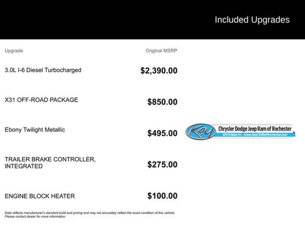 Key Chrysler Dodge Jeep Ram of Rochester is proud to present you with another True Market Priced Pre-Owned Vehicle. Transparent Pricing Of $ !! This 2021 GMC Sierra 1500 Elevation is loaded with the following Factory Options: 10-Speed Automatic, 4WD, and Black Cloth Cloth Rear Seat w/Storage Package, Elevation Convenience Package (Dual-Zone Automatic Climate Control, Heated Steering Wheel, Manual Tilt-Wheel & Telescoping Steering Column, and Rear Wheelhouse Liners), Elevation Value Package (Auto-Locking Rear Differential), Preferred Equipment Group 3SB (12-Volt Rear Auxiliary Power Outlet, 4G LTE Wi-Fi Hotspot Capable, Body-Color Surround Grille, Color-Keyed Carpeting Floor Covering, Compass, Deep-Tinted Glass, Electric Rear-Window Defogger, Electrical Lock Control Steering Column, Front Frame-Mounted Black Recovery Hooks, Front Rubberized-Vinyl Floor Mats, GMC Connected Access Capable, Keyless Open & Start, LED Cargo Area Lighting, OnStar & GMC Connected Services Capable, Power Door Locks, Power Front Windows w/Driver Express Up/Down, Power Front Windows w/Passenger Express Down, Power Rear Windows w/Express Down, Rear Dual USB Charging-Only Ports, Rear Rubberized-Vinyl Floor Mats, Remote Vehicle Starter System, Steering Wheel Audio Controls, and Theft Deterrent System (Unauthorized Entry)), Trailering Package (Hitch Guidance), X31 Off-Road Package (Dual Exhaust w/Premium Tips, Heavy-Duty Air Filter, Hill Descent Control, Off-Road Suspension, and X31 Hard Badge), 10-Speed Automatic, 4WD, Black Cloth, 10-Way Power Driver Seat Adjuster w/Lumbar, 220 Amp Alternator, 4-Way Manual Passenger Seat Adjuster, 4-Wheel Disc Brakes, 6 Speakers, 6-Speaker Audio System Feature, ABS brakes, Air Conditioning, Alloy wheels, AM/FM radio: SiriusXM, Apple CarPlay/Android Auto, Automatic temperature control, Brake assist, Bumpers: body-color, Cloth Seat Trim, Delay-off headlights, Driver door bin, Driver vanity mirror, Dual front impact airbags, Dual front side impact airbags, Electronic Stability Control, Engine Block Heater, Front 40/20/40 Split-Bench Seat, Front anti-roll bar, Front Center Armrest w/Storage, Front dual zone A/C, Front fog lights, Front License Plate Kit, Front reading lights, Front wheel independent suspension, Fully automatic headlights, Heated door mirrors, Heated Driver & Front Outboard Passenger Seating, Heated front seats, Heated steering wheel, Heavy Duty Suspension, Illuminated entry, Integrated Trailer Brake Controller, Low tire pressure warning, Occupant sensing airbag, Outside temperature display, Overhead airbag, Overhead console, Panic alarm, Passenger door bin, Passenger vanity mirror, Power door mirrors, Power driver seat, Power steering, Power windows, Premium audio system: GMC Infotainment System, Radio data system, Radio: GMC Infotainment Audio System, Rear reading lights, Rear seat center armrest, Rear step bumper, Rear window defroster, Remote keyless entry, Security system, SiriusXM Radio, Speed control, Speed-sensing steering, Split folding rear seat, Steering wheel m